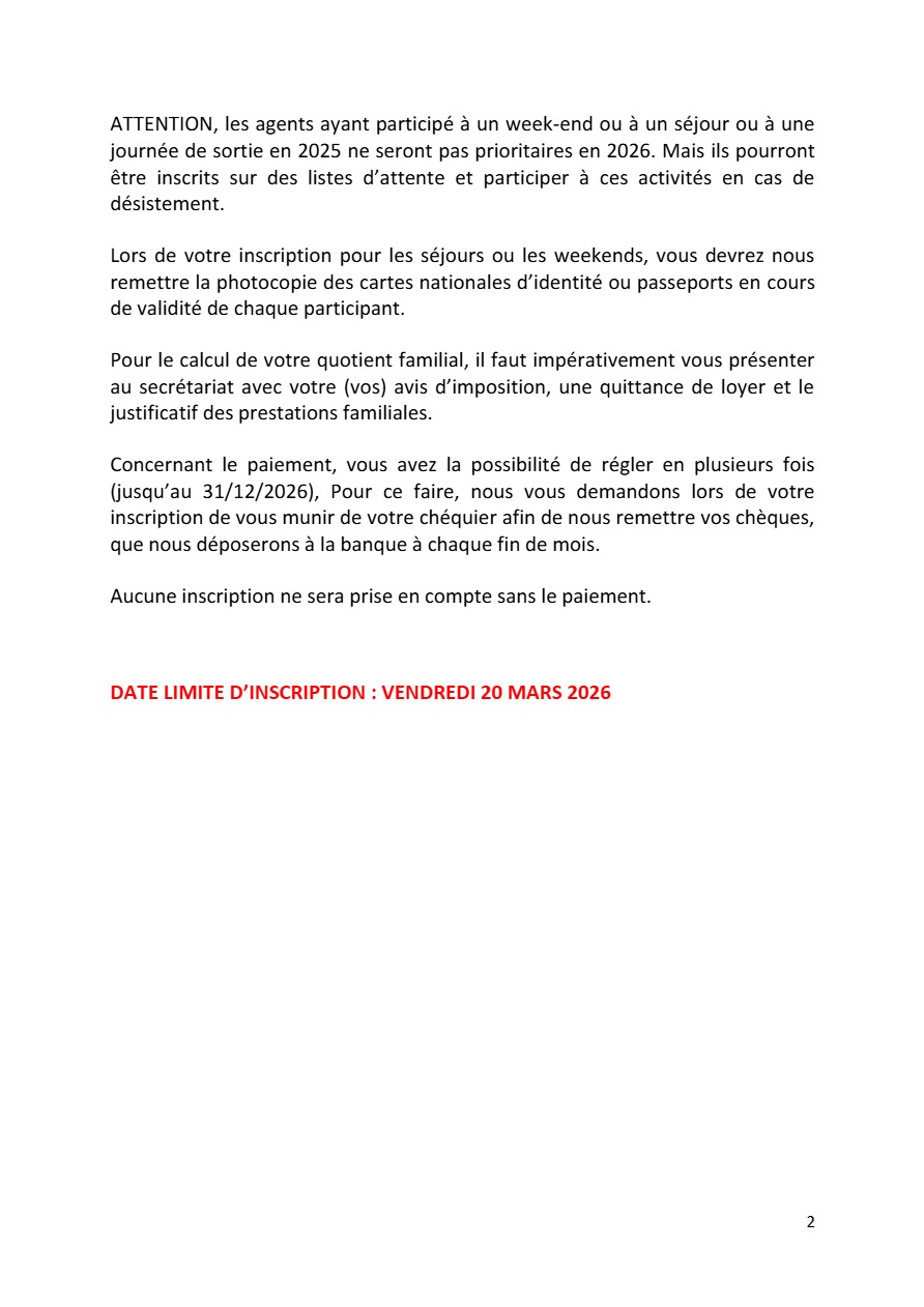 - Ouverture des avantages aux enfants à charge (étudiant ou privé d’emploi – remettre un justificatif au secrétariat) jusqu’à 25 ans date anniversaire, uniquement pour les sorties, week-ends et séjours.